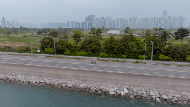 Bustling Seoul cityscape with a long straight boulevard on a clear day