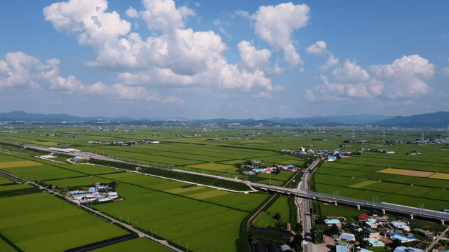 Expansive green rice fields under the sky