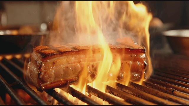 Marinated Grilled Pork Belly Cooking on the Grill with Rising Smoke