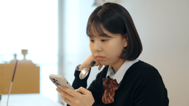 Student using a smartphone in a school hallway