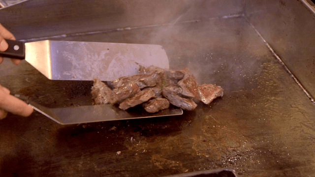 Chef skillfully removing shrimp tail on hot griddle