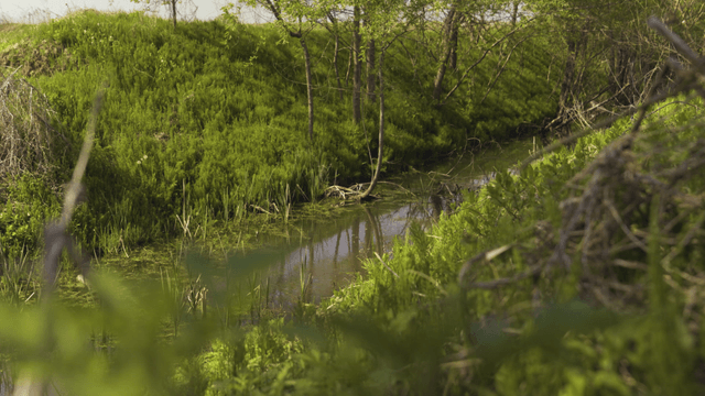 A tranquil stream flowing through lush greenery