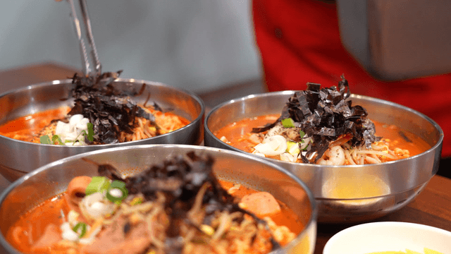 Spicy Korean rice cake ramen with bean sprouts and seaweed garnish