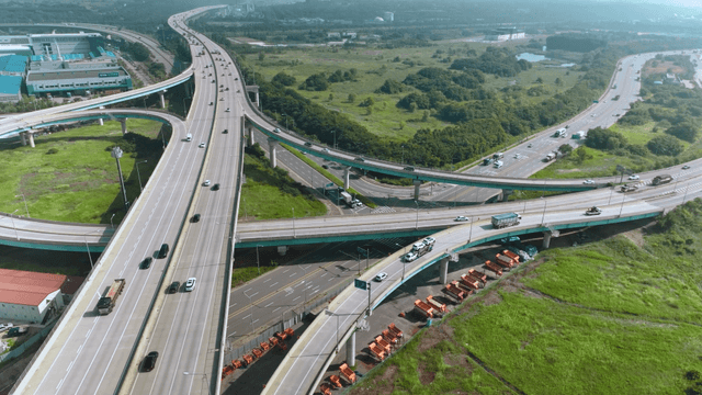 Aerial view of a highway and green spaces