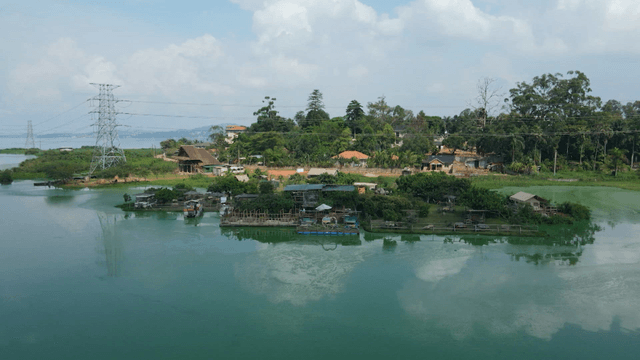 Serene lakeside village with greenery