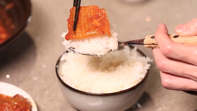 Table set with rice and kimchi stew topped with cherry tomatoes