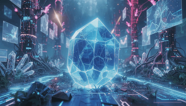 Futuristic landscape with glowing crystal