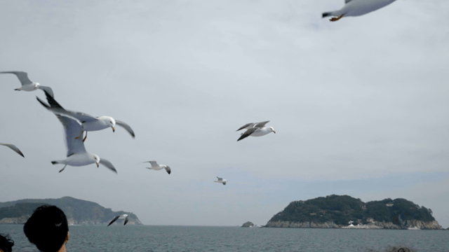 Person observing seagulls by the sea