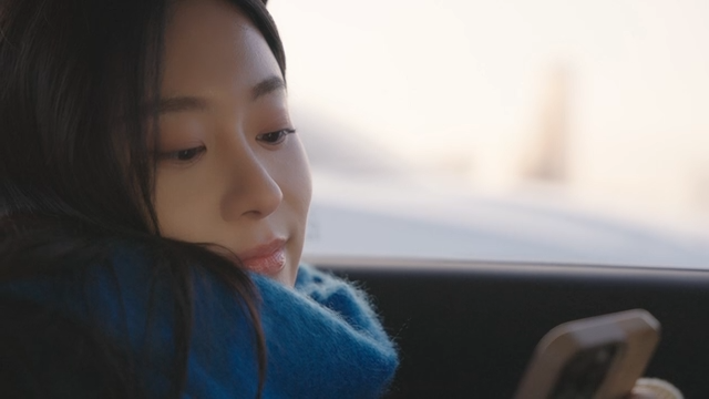 Woman looking at her phone in a taxi