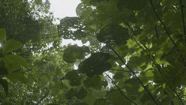 Rain falling on lush green forest leaves