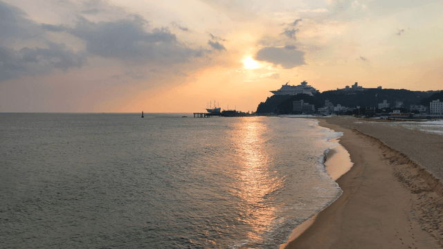 Sunset on tranquil beach with boat-shaped hotel visible in distance