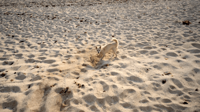 Small poodle dog resting next to crates of tomatoes in a produce warehouse