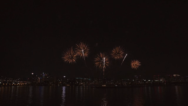Spectacular Fireworks over the Cityscape and River at Night