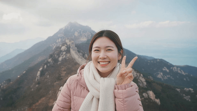 Woman drinking from thermos next to snow-covered mountain path signpost