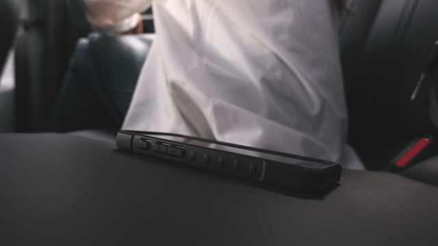 Woman looking at her phone in a taxi