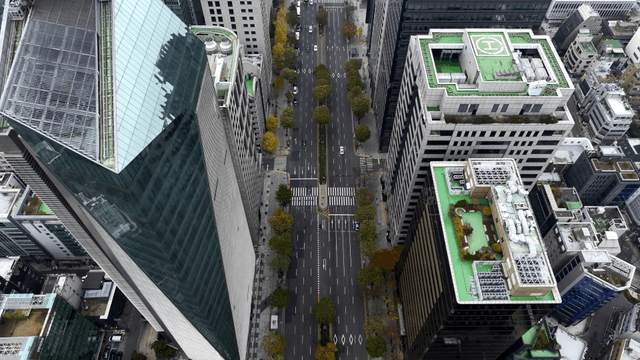 Bustling city street lined with skyscrapers