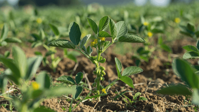 Green soybean plants in a sunny field