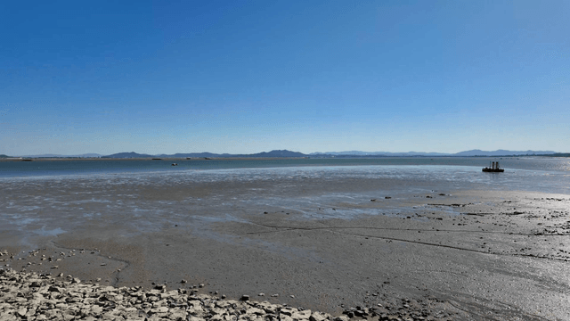 Vast tidal flat with distant mountains