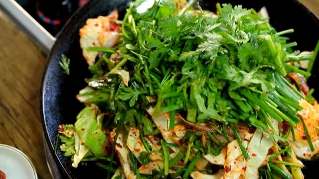 Spicy Bulgogi Hot Pot with Crown Daisy boiling in a pot