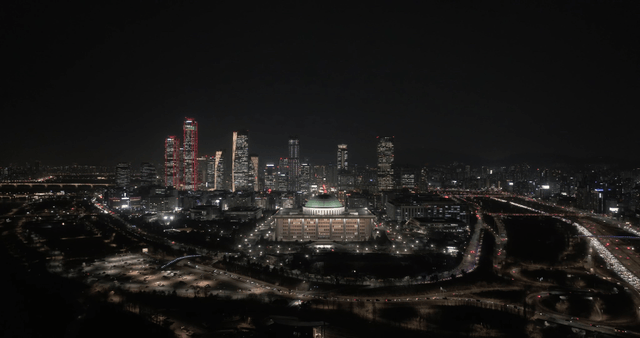 Bustling neiborhood at night with brightly lit buildings and a visible tower