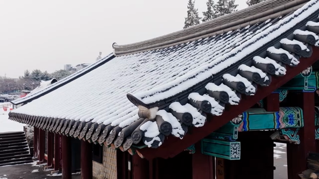 Snow-covered traditional Korean roof