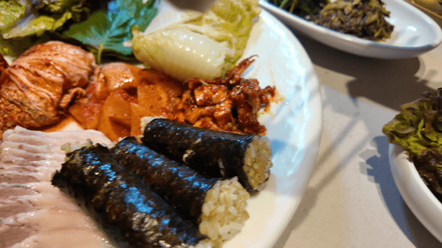 A close-up view of Korean dishes including cabbage kimchi, boiled pork slices, and soybean paste ste