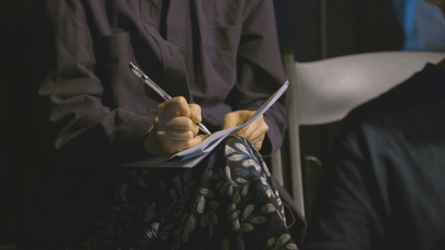 Person writing notes in a dimly lit room