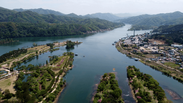 A river winding through lush green mountains