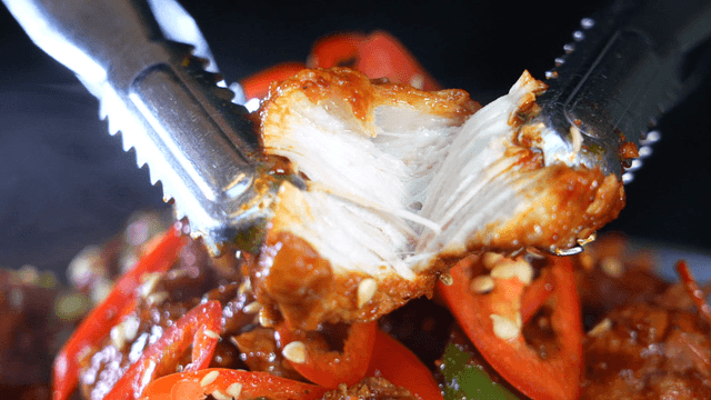 Tongs and scissors tearing spicy braised ribs