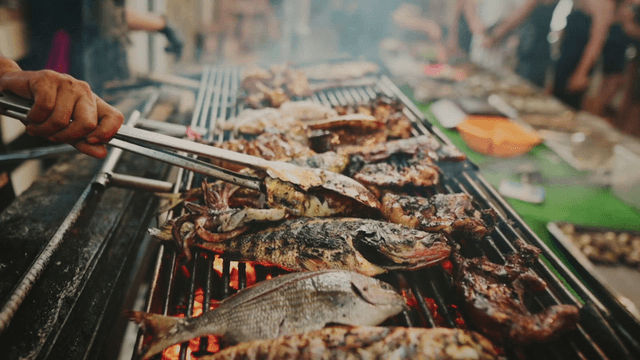 Grilled pork parts sizzling on a restaurant's barbecue grill