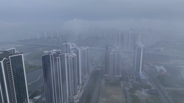 Skyscrapers shrouded in morning fog
