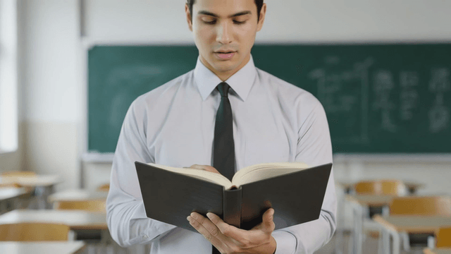 Teacher reading a textbook and communicating with students in the classroom