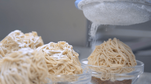 Cutting a sweet potato soufflé pancake sprinkled with powdered sugar with a knife