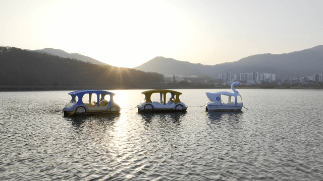 Dcked small boats on a calm Baegunhosu Lake on a sunny day