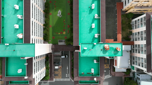 Apartment Complex with Cherry Blossoms on a Sunny Spring Day