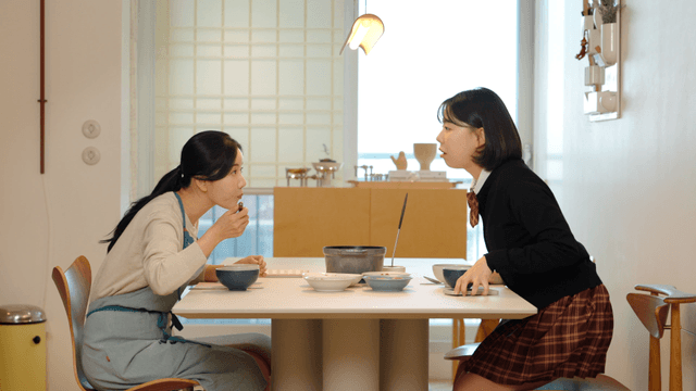 Mother and daughter sitting on sofa, looking straight ahead and smiling
