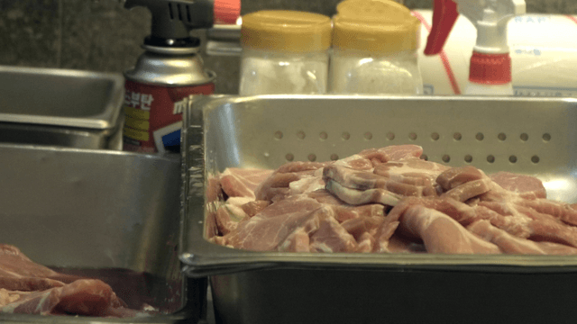 Raw pork slices being placed in a pan