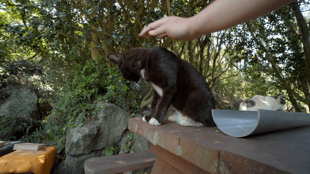 Person stroking cat on wooden table