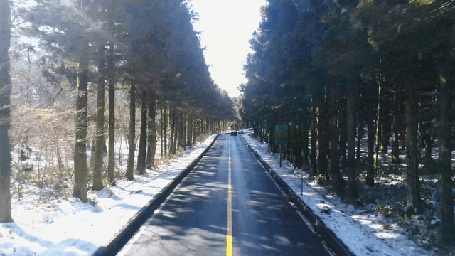 Cars driving along a scenic road lined with cherry blossoms and rape blossoms