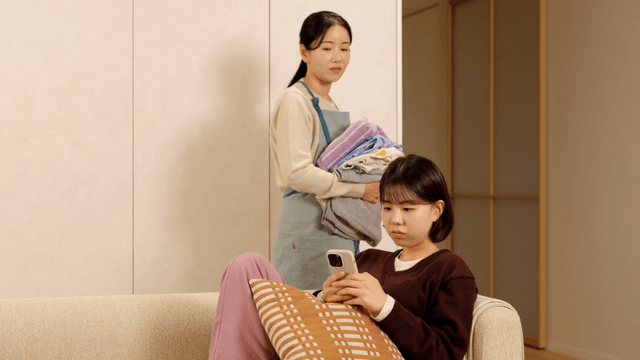 Mother looking at her daughter using her smartphone with pitiful expression.
