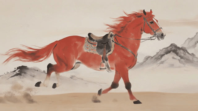 Red horse running in desert landscape