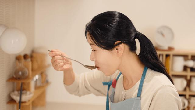 Woman tasting soup with ladle in cozy kitchen