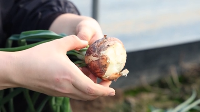 Freshly harvested leeks held in hands
