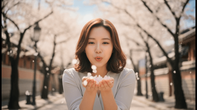 Woman smiling happily while throwing cherry blossoms in spring
