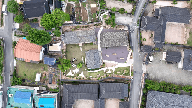 Traditional Hanok village with tiled roofs laid out in a grid pattern