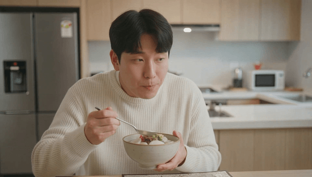 Man eating tteokguk in cozy kitchen