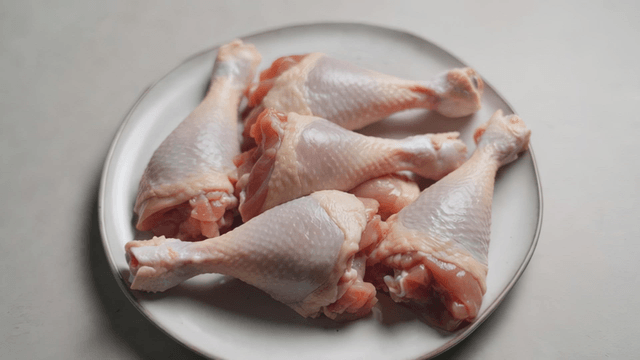 Raw chicken drumsticks on a white plate