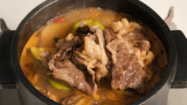 Beef soybean paste stew topped with simmering chadolbagi in pot