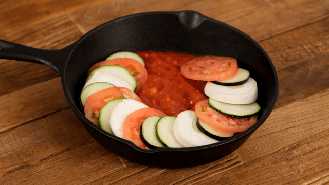 Ratatouille, layering eggplant and tomatoes on top of tomato sauce in pan