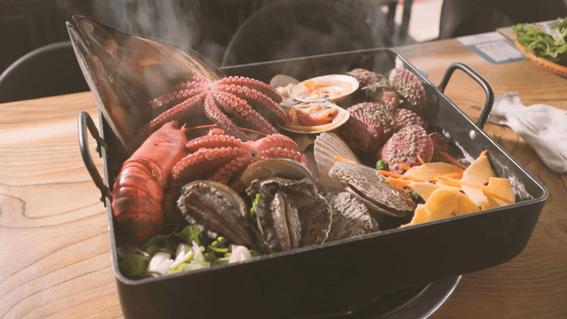Various seafood such as octopus and abalone boiling in a pot